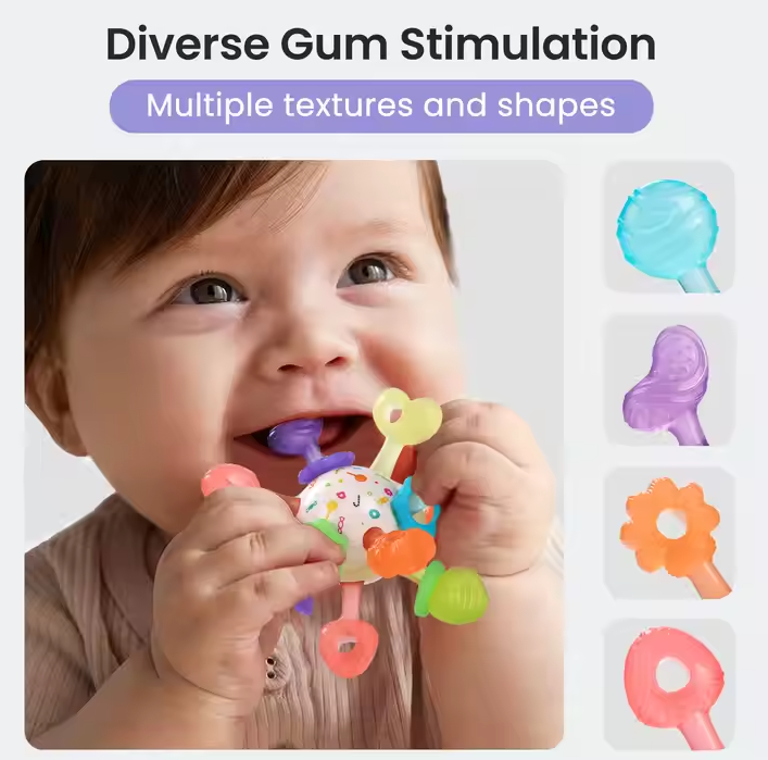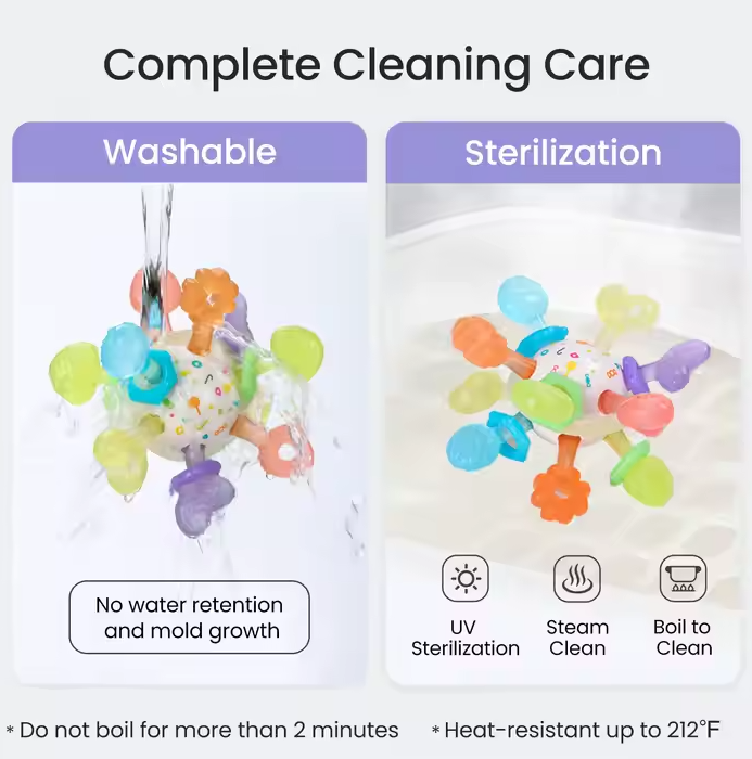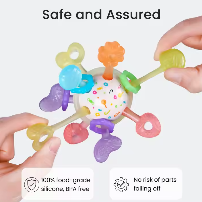 باطراحی اکونومیک و مواد ایمن و سیلیکون مواد غذایی، این دندانگیر با بافت و اشکال متنوعی که دارد لثه های نوزاد شما را تحریک میکند و به کاهش ناراحتی و تسکین درد لثه ها کمک میکند.بدون خطر اینکه قطعات از دندانگیر جدا شوند راحت میتوان تمیز کرد و قابل شستشوست. به هیچ عنوان آب به داخل نفوذ نمیکند و همین مزیت از کپک زدن جلوگیری میکند.در برابر حرارت تا 212 درجه مقاومت دارد و برای ضدعفونی کامل تا حداکثر 2دقیقه میتوان در آب جوشاند تا کاملا استریلیزه شود.