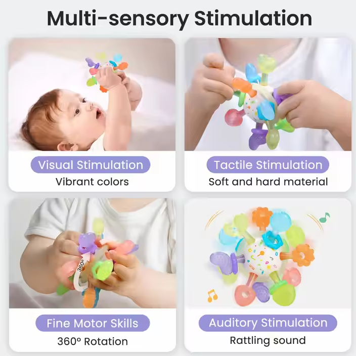 رنگ های جذاب و گیرایی دارد که با توجه به صدای جغجغه ای که با چرخش 360درجه چرخشش تولید میکند، باعث میشود نوزاد بسیار سرگم شود.