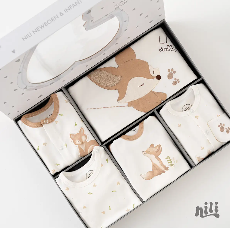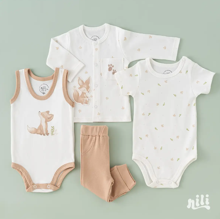 محتویات بسته: زیردکمه آستین کوتاه، زیردکمه رکابی، سرهمی جورابدار، مانتو، شلوار، پیشبند، کلاه گرد، یک جفت جوراب، یک جفت دستکش، آروغ گیر، دورپیچ نخی کلاه دار
