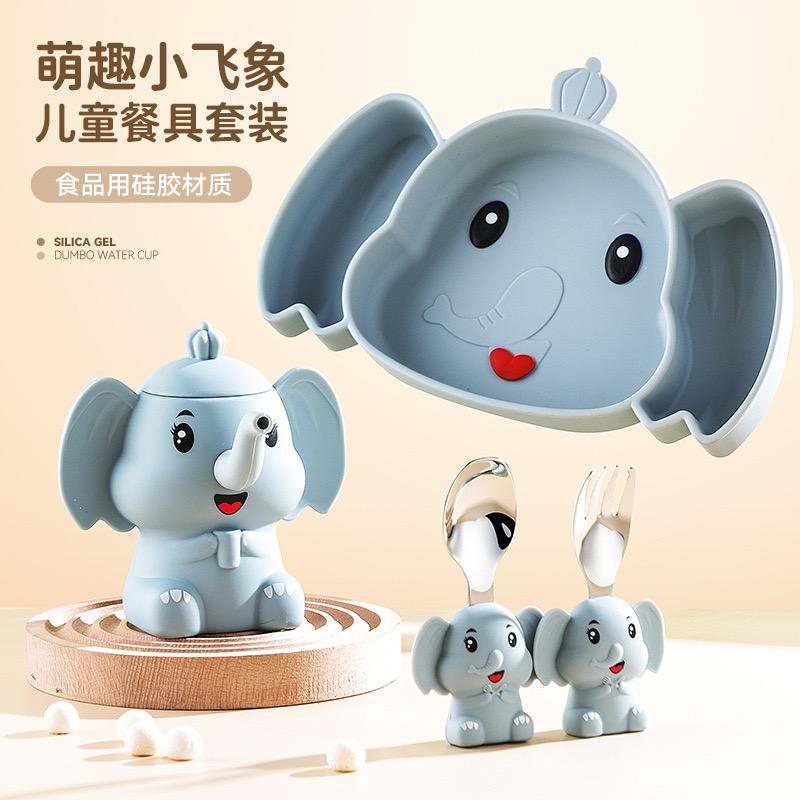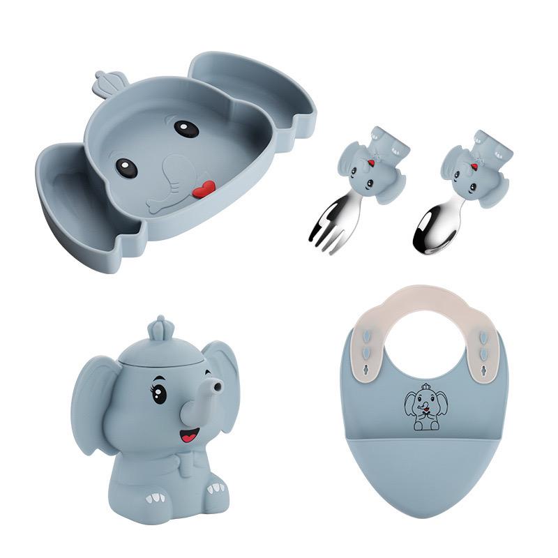 ست ظرف سیلیکونی 6 تکه فیل طوسی همراه با جعبه و قاشق چنگال استیل