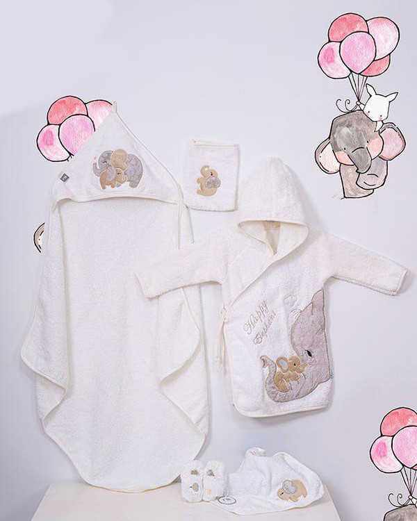 این ست شامل حوله تن پوش، حوله دورپیچ کلاه دار، حوله دست و صورت ، لیف و یک جفت پاپوش نوزادی است.