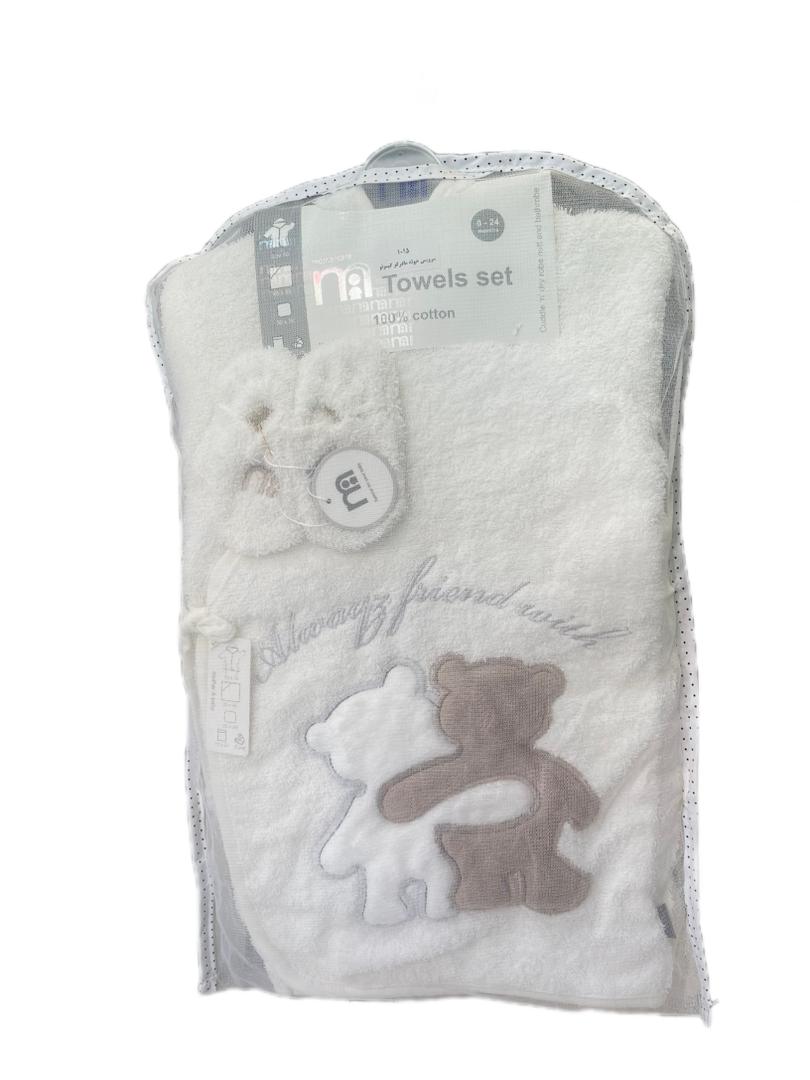 این ست شامل حوله تن پوش، حوله دورپیچ کلاه دار، حوله دست و صورت ، لیف و یک جفت پاپوش نوزادی است.