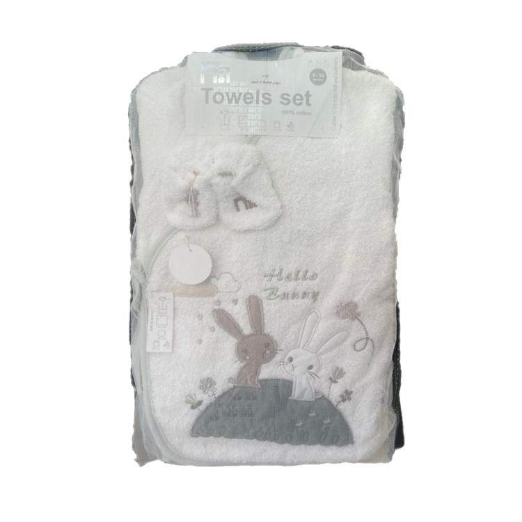 این ست شامل حوله تن پوش، حوله دورپیچ کلاه دار، حوله دست و صورت ، لیف و یک جفت پاپوش نوزادی است.