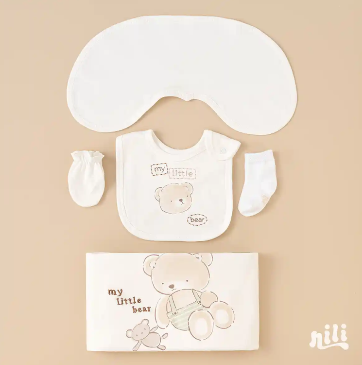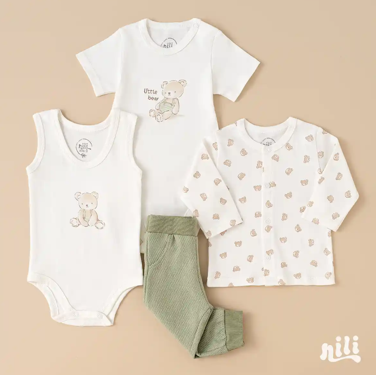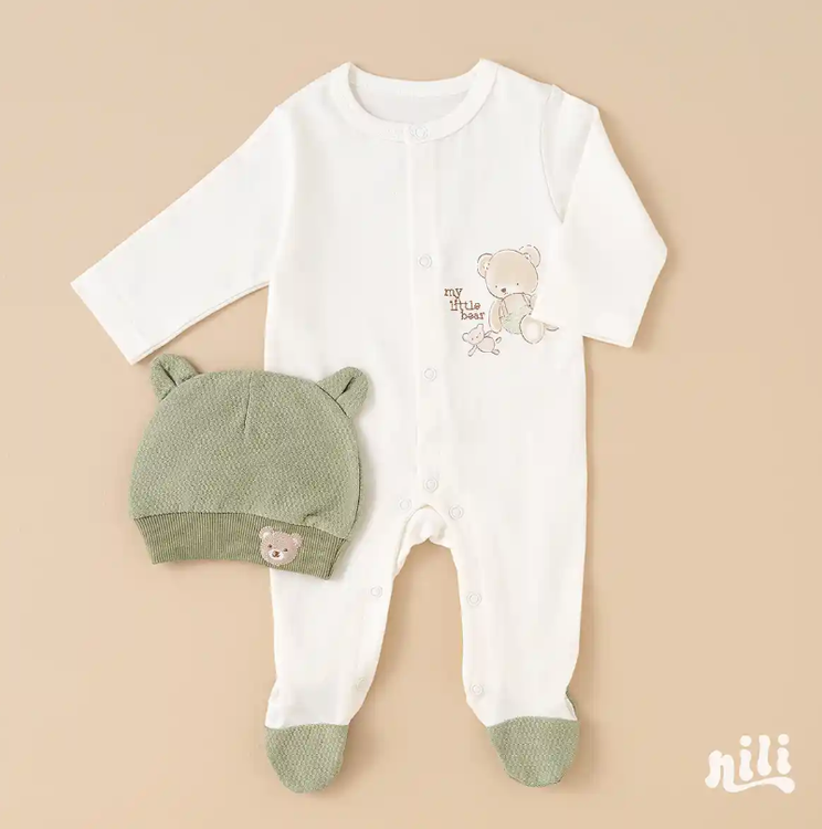 محتویات بسته: زیردکمه آستین کوتاه، زیردکمه رکابی، سرهمی جورابدار، مانتو، شلوار، پیشبند، کلاه گرد، یک جفت جوراب، یک جفت دستکش، آروغ گیر، دورپیچ نخی کلاه دار