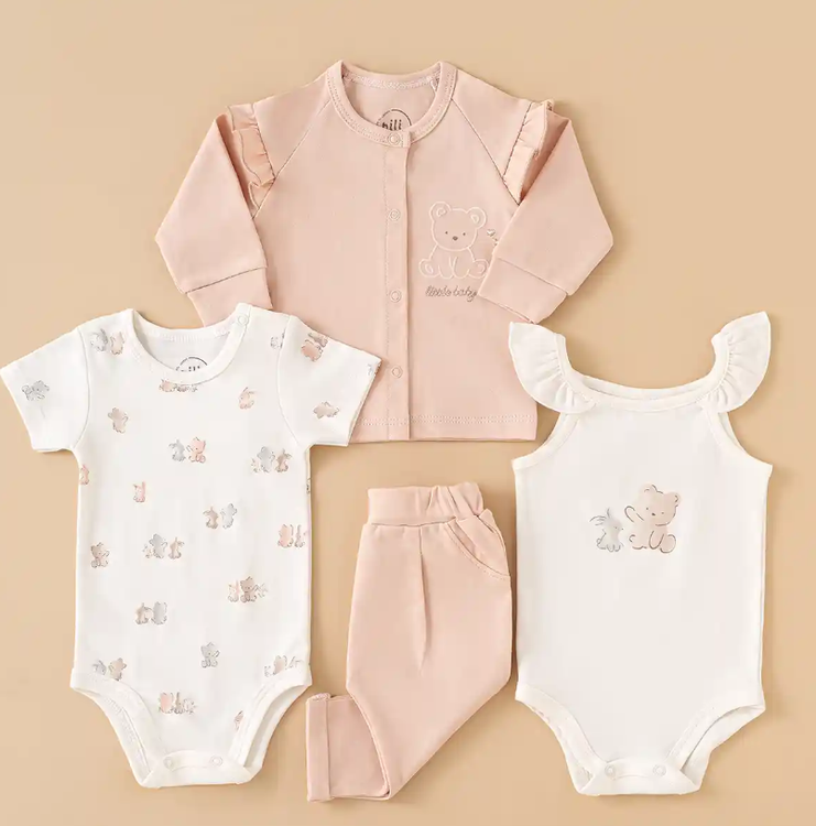 محتویات بسته: زیردکمه آستین کوتاه، زیردکمه رکابی، سرهمی جورابدار، مانتو، شلوار، پیشبند، کلاه گرد، یک جفت جوراب، یک جفت دستکش، آروغ گیر، دورپیچ نخی کلاه دار