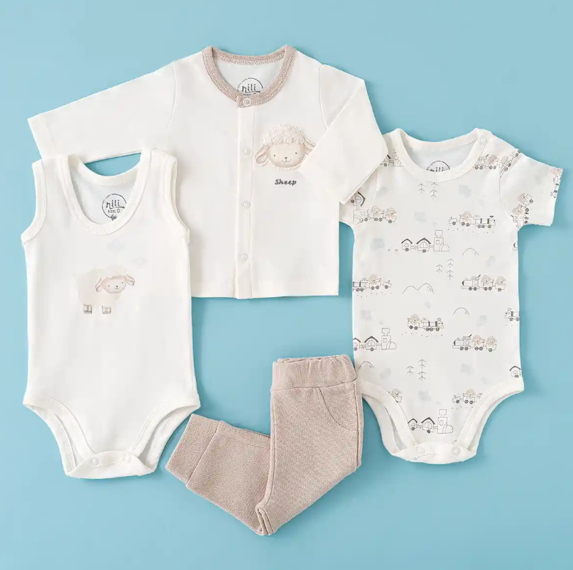 زیردکمه آستین کوتاه، زیردکمه رکابی، سرهمی جورابدار، مانتو، شلوار، پیشبند، کلاه گرد، یک جفت جوراب، یک جفت دستکش، آروغ گیر، دورپیچ نخی کلاه دار