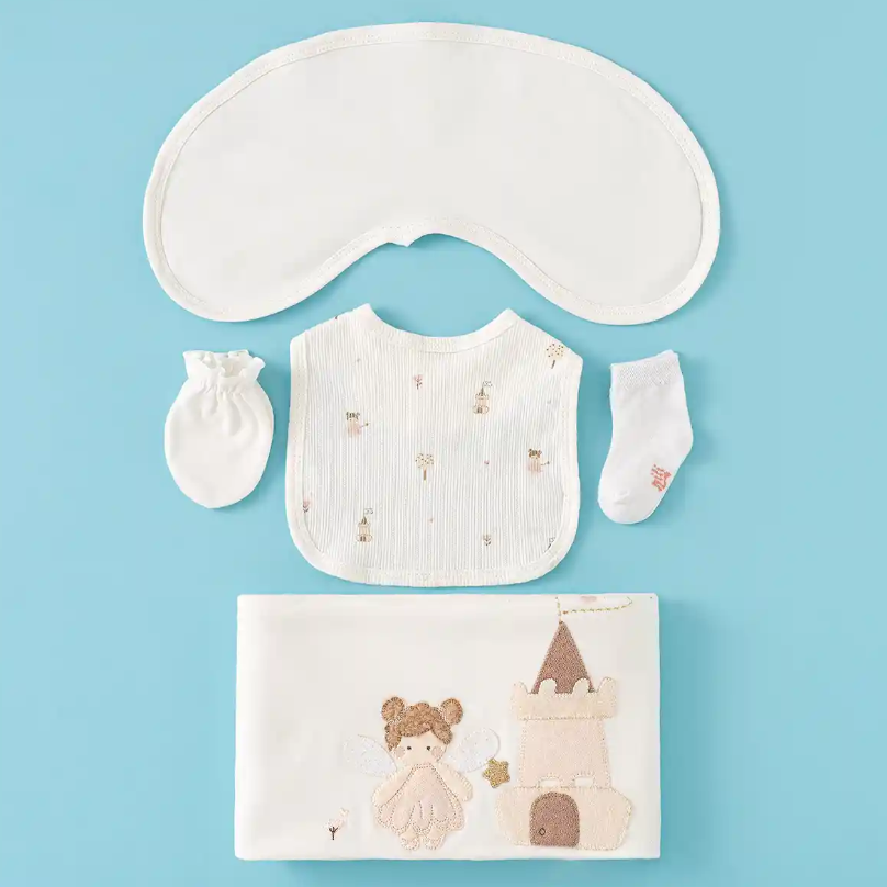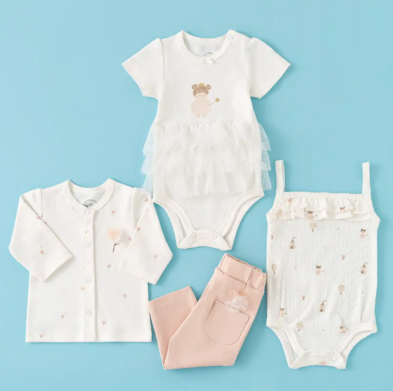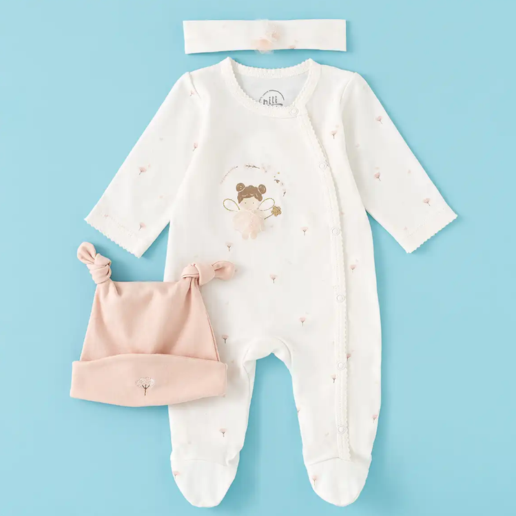 محتویات بسته: زیردکمه آستین کوتاه، زیردکمه رکابی، سرهمی جورابدار، مانتو، شلوار، پیشبند، کلاه گرد، یک جفت جوراب، یک جفت دستکش، آروغ گیر، دورپیچ نخی کلاه دار