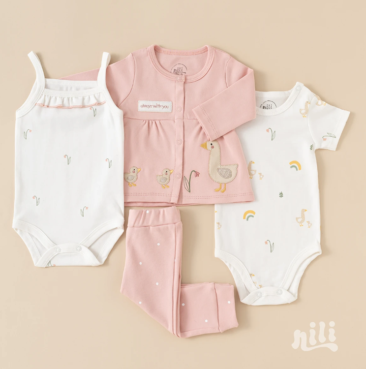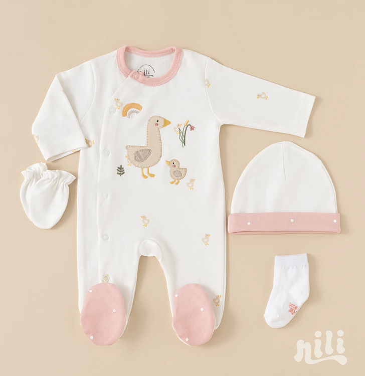 جنس: 100% نخ پنبه - ضد حساسیت - تمام کار های گلدوزی شده داخل لباس کاور نخی داره و بدن کودک رو اذیت نمیکنه