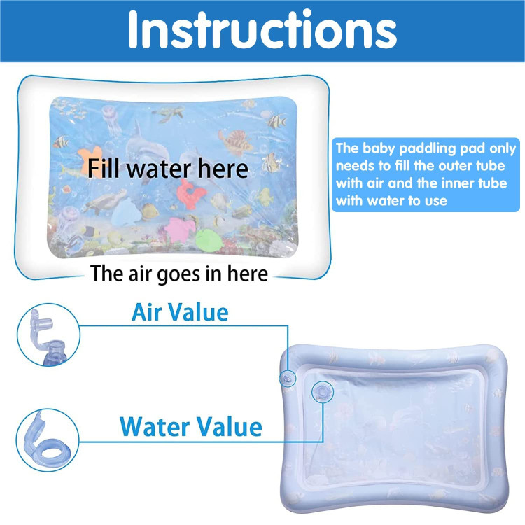 سفره آکواریومی اسباب بازی دخترانه و پسرانه با طرح حیوانات دریایی و زمینه آبی رنگ با صفحه ای مستطیل به همراه آینه ای بی خطر و جغجغه هایی که در دو طرف آن کار شده است که برای بازی دلبندان بالای 3 ماه شما مناسب می باشد. در پشت این محصول دو درپوش قرار گرفته است با اندازه های مختلف قرار گرفته است. قسمت بیرونی را به آسانی توسط هوا و قسمت درونی آن را با آب پر کنید که در نهایت حالت آکواریومی به خود می گیرد.