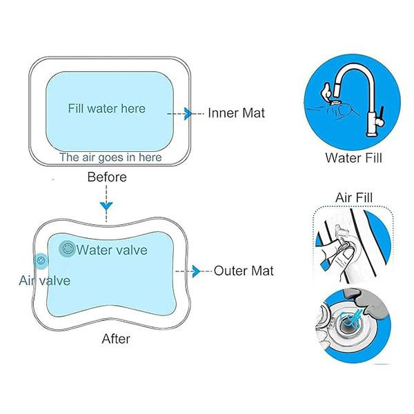 ✅ پر کردن آسان: باد کردن واتر مت به وسیله تلمبه به سادگی انجام میشود. پس از باد شدن، میتوانید از طریق درب مخزن، آن را با آب گرم یا سرد (به دلخواه) پر کنید و دنیای آبی شگفتانگیز واتر مت را برای بازی کودکتان آماده کنید.