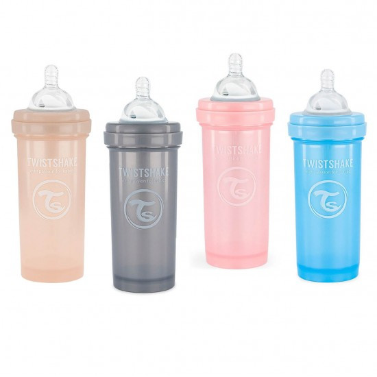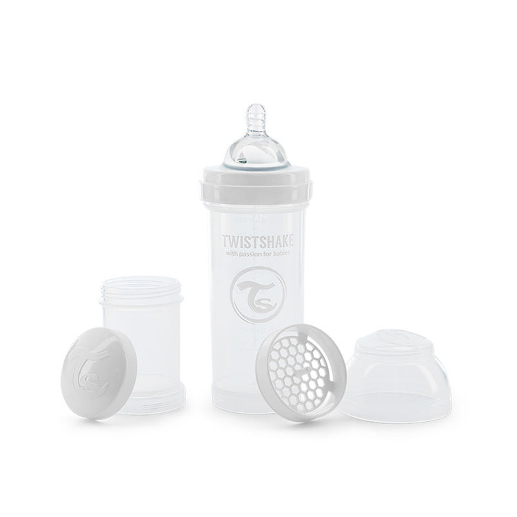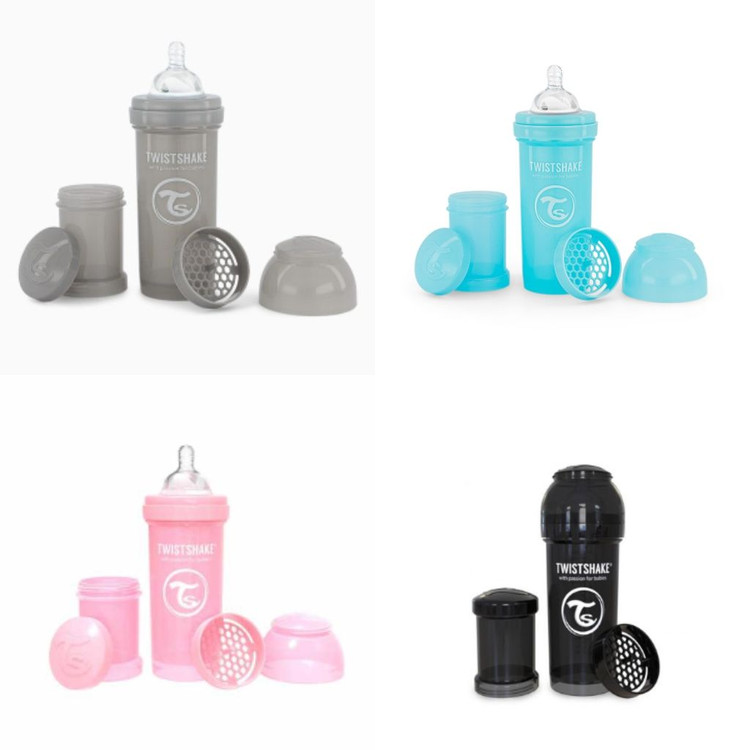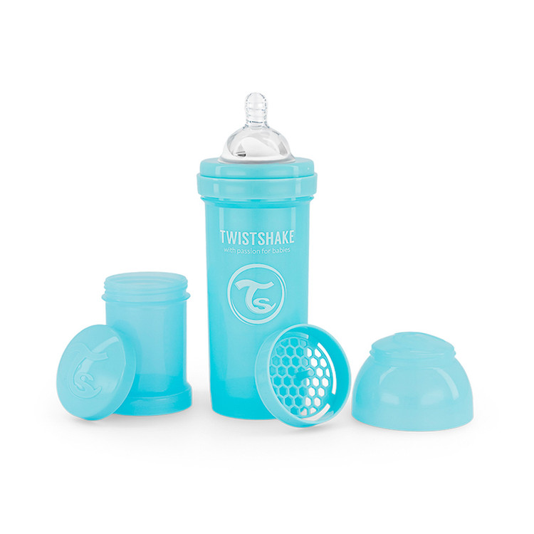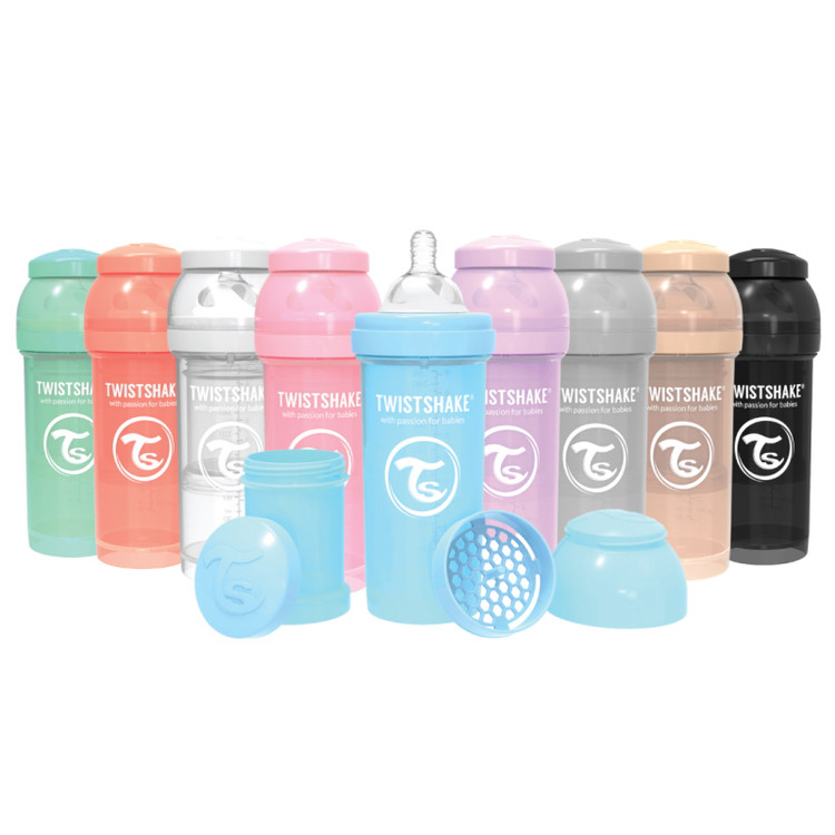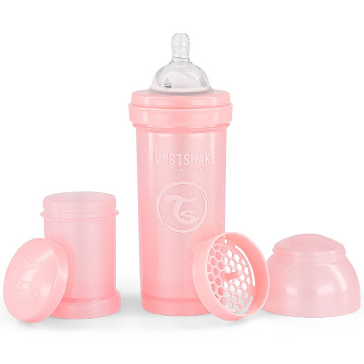 - شیشه شیر آنتی کولیک تویست شیک پاستلی با ظرفیت 260 میلی لیتر، راه حلی بی نظیر برای کاهش دردهای شکمی نوزادان و آرام کردن آنهاست. به کمک این شیشه شیر و طراحی بی نظیرش تمامی توده های حل نشده به کمک یک شبکه توری حل خواهد شد از این رو کودک با مشکلاتی نظیر کولیک یا