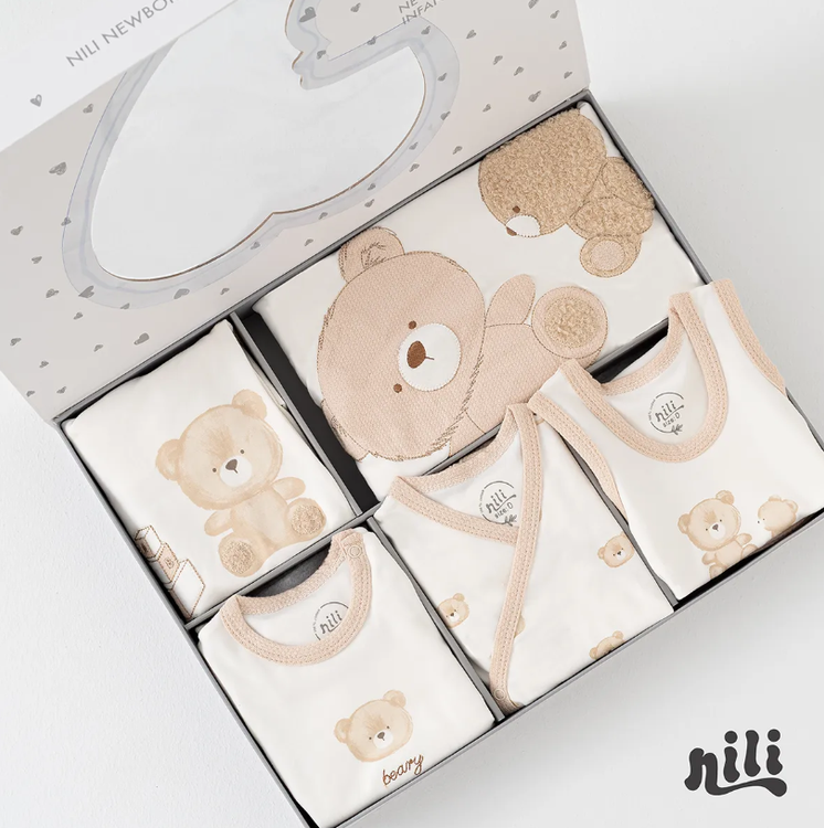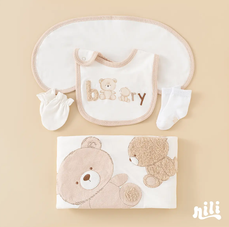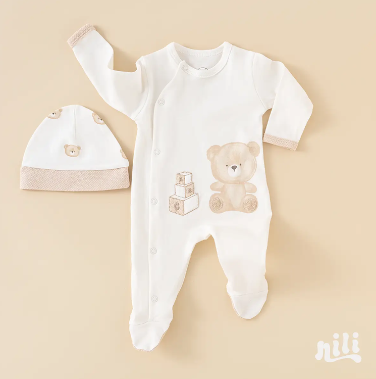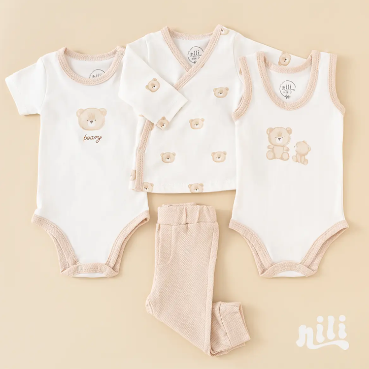 محتویات بسته: زیردکمه آستین کوتاه، زیردکمه رکابی، سرهمی جورابدار، مانتو، شلوار، پیشبند، کلاه گرد، یک جفت جوراب، یک جفت دستکش، آروغ گیر، دورپیچ نخی کلاه دار