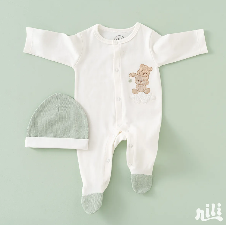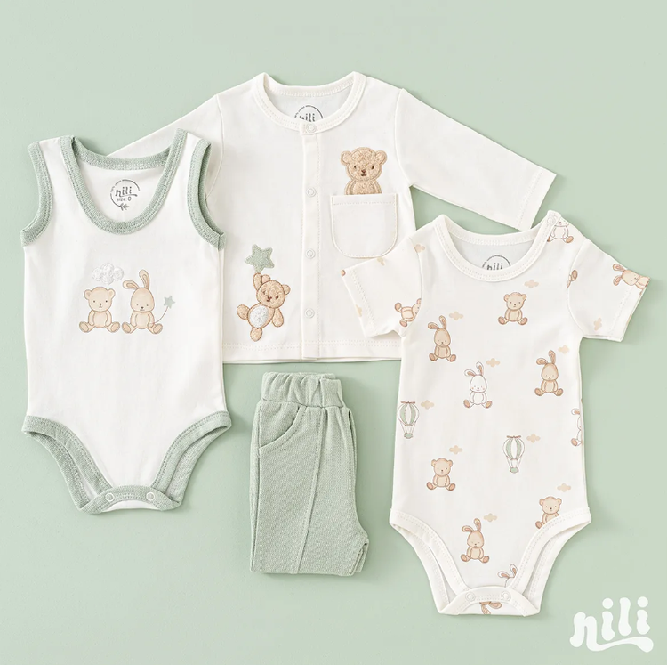 جنس: 100% نخ پنبه - ضد حساسیت - تمام کار های گلدوزی شده داخل لباس کاور نخی داره و بدن کودک رو اذیت نمیکنه