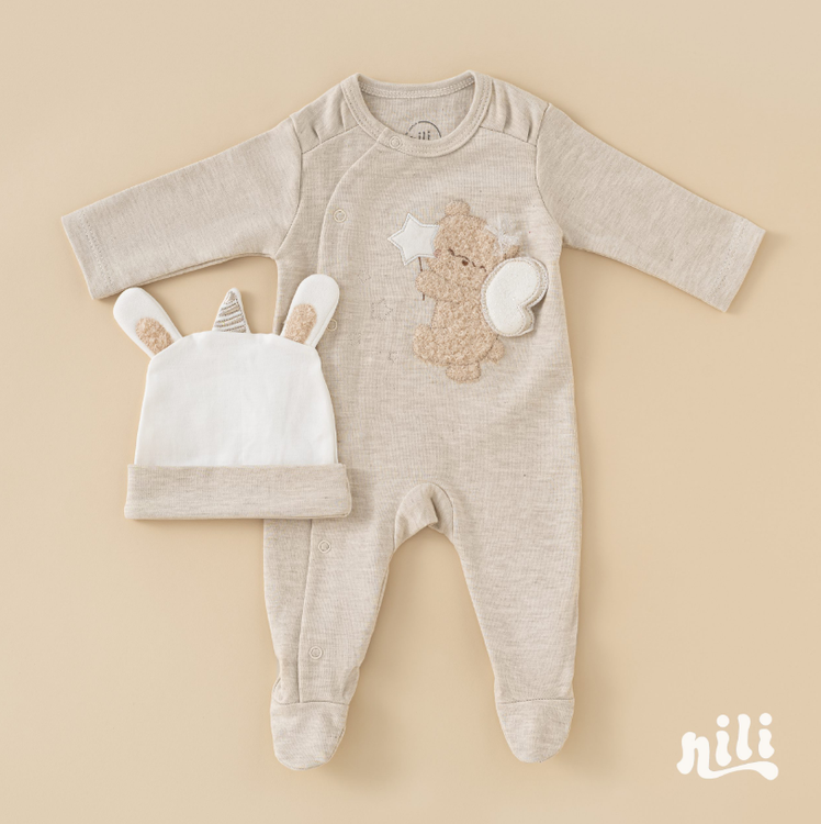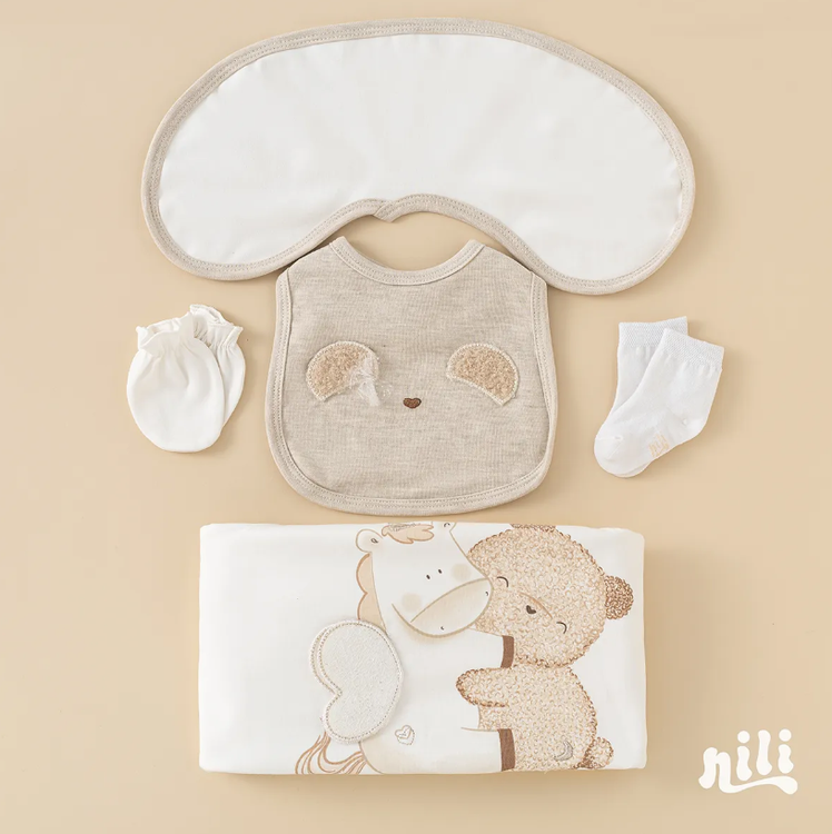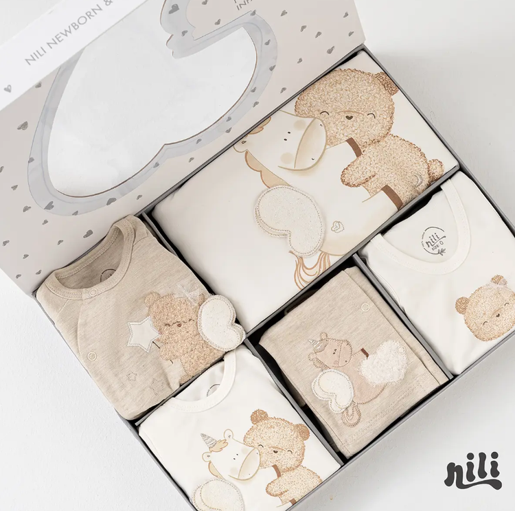 محتویات بسته: زیردکمه آستین کوتاه، زیردکمه رکابی، سرهمی جورابدار، مانتو، شلوار، پیشبند، کلاه گرد، یک جفت جوراب، یک جفت دستکش، آروغ گیر، دورپیچ نخی کلاه دار
