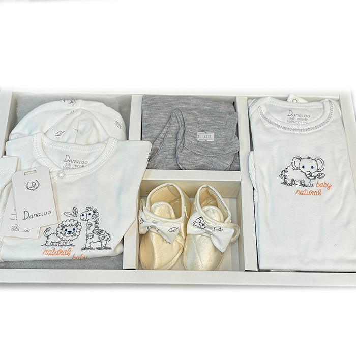 محتویات بسته: بلوز مانتویی آستین بلند/ بادی آستین کوتاه زیر دکمه/شلوار کمرکش /پیشبند/کلاه/دستکش/پاپوش مجلسی