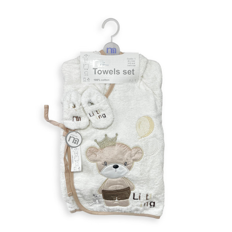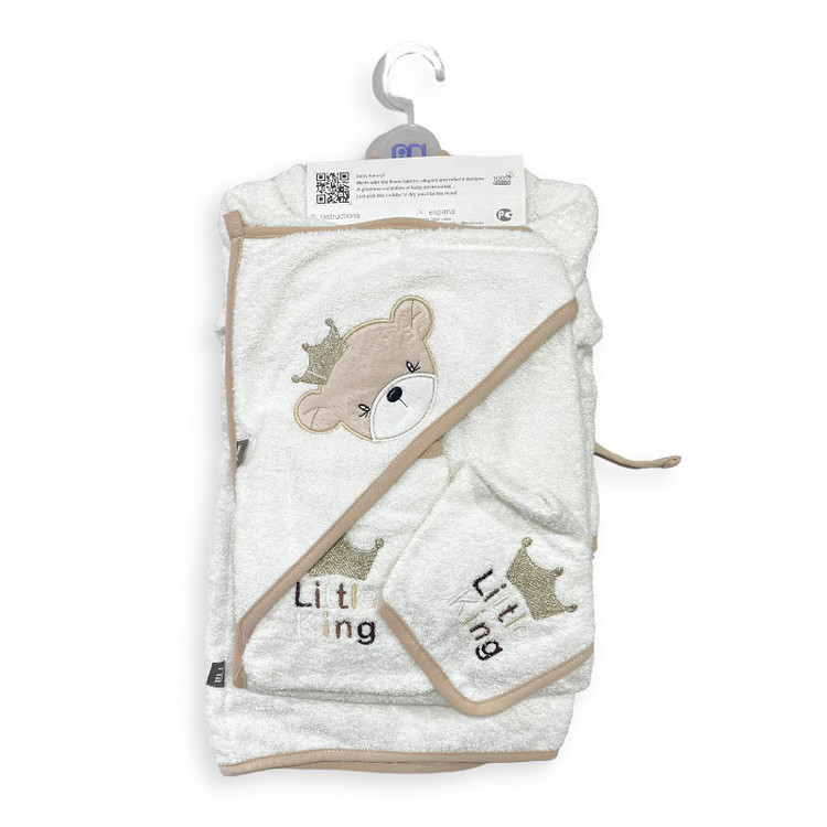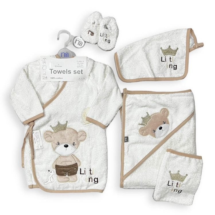 این ست شامل حوله تن پوش، حوله دورپیچ کلاه دار، حوله دست و صورت ، لیف و یک جفت پاپوش نوزادی است.