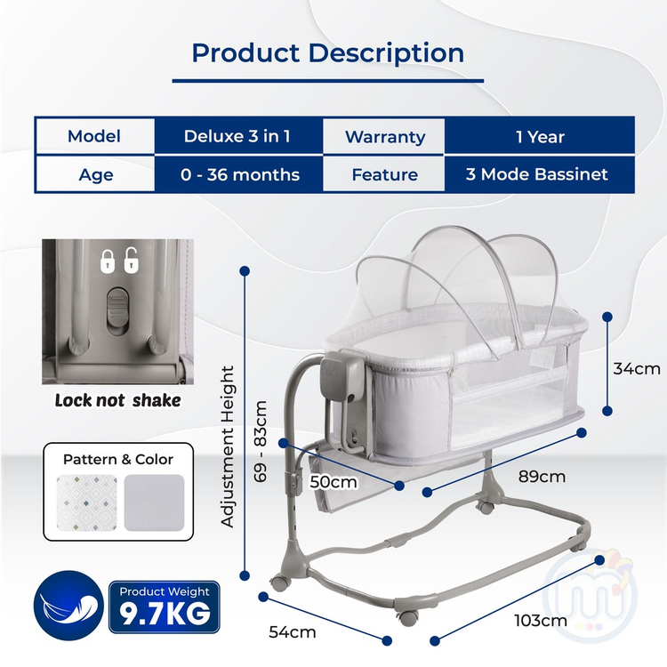مدل سهکاره گهواره برقی ماستلا، از یک فریم فلزی محکم و پایدار به همراه یک تخت سبک برای خوابیدن نوزاد تشکیل شده است که قابلیت حرکت گهوارهای خودکار را دارد.