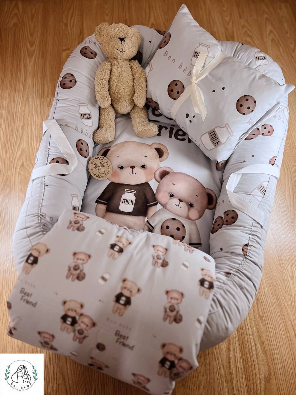 سرویس تشک گارد دار 4 تکه طرح خرس و دونات طوسی Bonbebe بان ب ب | تشک لبه دار نوزاد
