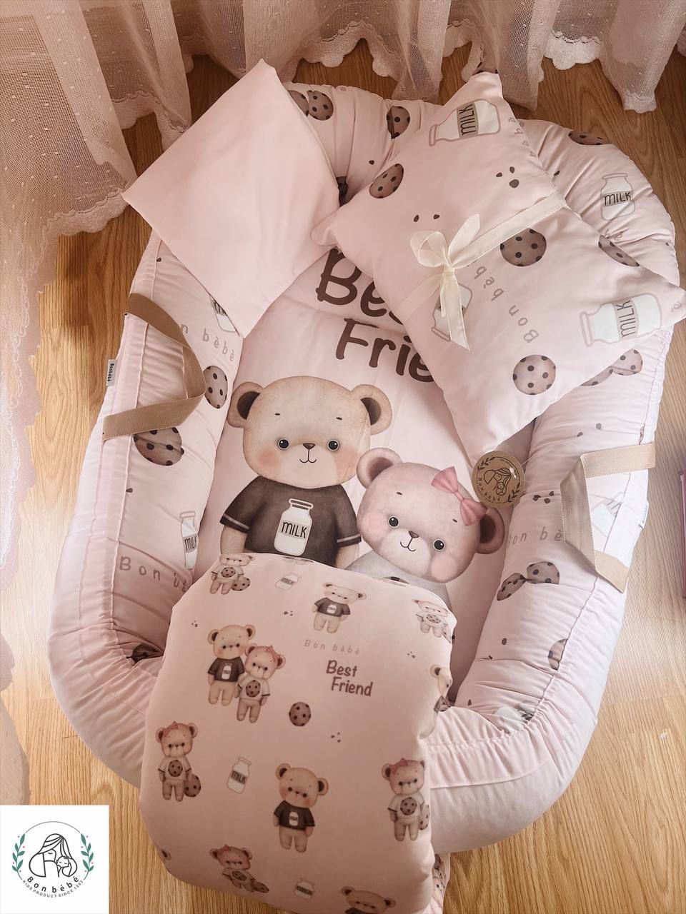 سرویس تشک گارد دار 4 تکه طرح خرس و دونات صورتی Bonbebe بان ب ب | تشک لبه دار نوزاد