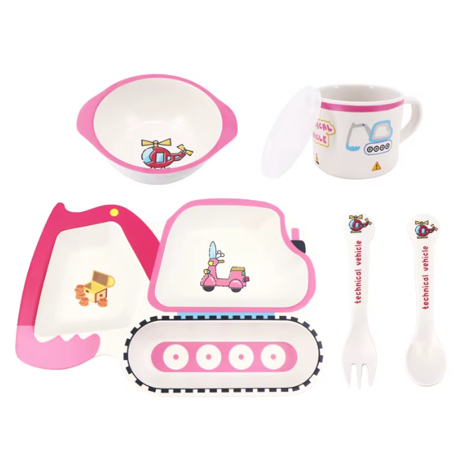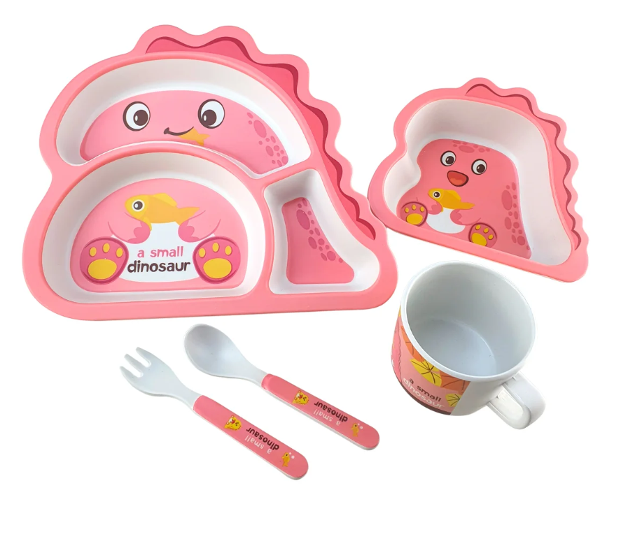 ست ظرف غذا بامبو 5 تکه کودک طرح دایناسور صورتی