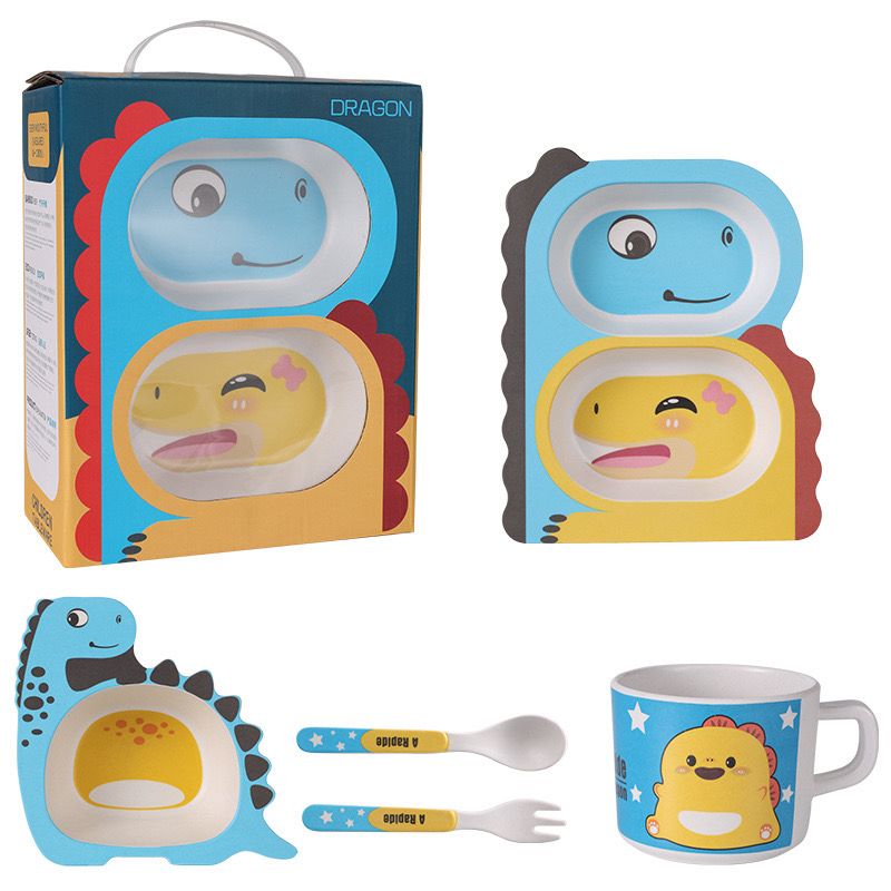 ست ظرف غذا بامبو 5 تکه کودک طرح دایناسور آبی
